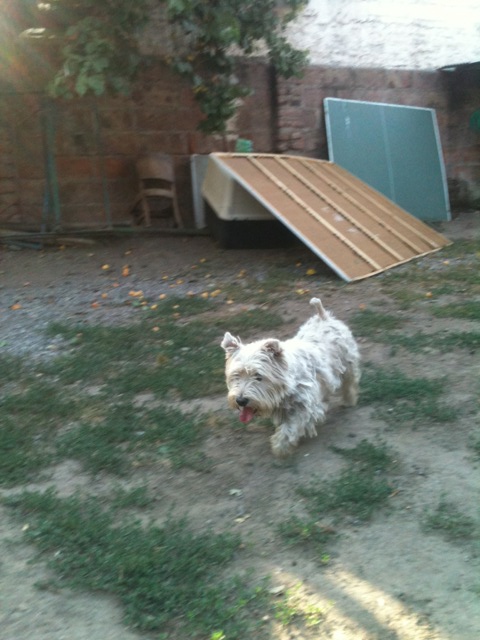 Sigue a los niños, mueve su colita como un loco, es un west highland macho de uno o dos años.
