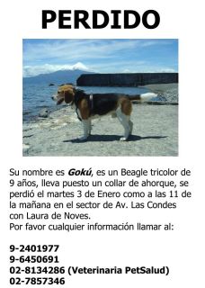 Natividad Mardones Se llama Gokú, tiene 9 años, se perdió hoy martes 3 de enero a las 11 de la mañana en el sector de Av. Las Condes con Laura de Noves (altura estadio Israelita), llevaba solo un collar de ahorque. Por favor si alguien tiene informacion llamar al: 96450691 o escribirme a traves de facebook. |