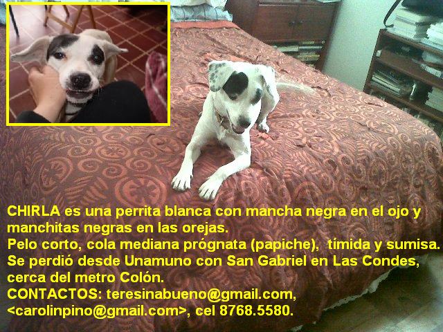 !!!!!U R G E N T E!!!!! CANDY SE PERDIÒ EN LA NOCHE DE AÑO NUEVO,POR LOS JUEGOS ARTIFICIALES SE ASUSTÓ Y SALTÓ LA PARED. NO LLEVA COLLAR MIDE 30 CM.ES MUY AMISTOSA Y JUGUETONA TIENE 3 AÑOS DE EDAD,NUNCA HABÍA SALIDO A LA CALLE... SECTOR CALLE SANTA ANA PARADERO 19 DE AV. SANTA ROSA - COMUNA LA GRANJA,CORRE MUY RAPIDO..PUEDE ESTAR EN CUALQUIER LUGAR POR FAVOR SI LA VEN RETENGANLA Y LLAMAR A ALEJANDRO 87647966 O 5269481.. LA FAMILIA ENTERA ESTÁ SUFRIENDO. DIFUNDIR POR FAVOR!!!!!! |